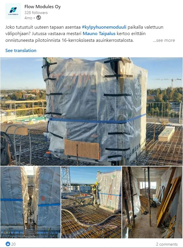 Kehitämme ja toimitamme teollisen rakentamisen ratkaisuja, jotka nostavat rakennushankkeiden esivalmistusasteen ja tahtituotanto-osaamisen korkealle. Asunnot valmistuvat laadukkaampina ja huomattavasti lyhyemmällä läpimenoajalla – tänään ja tulevaisuudessa.